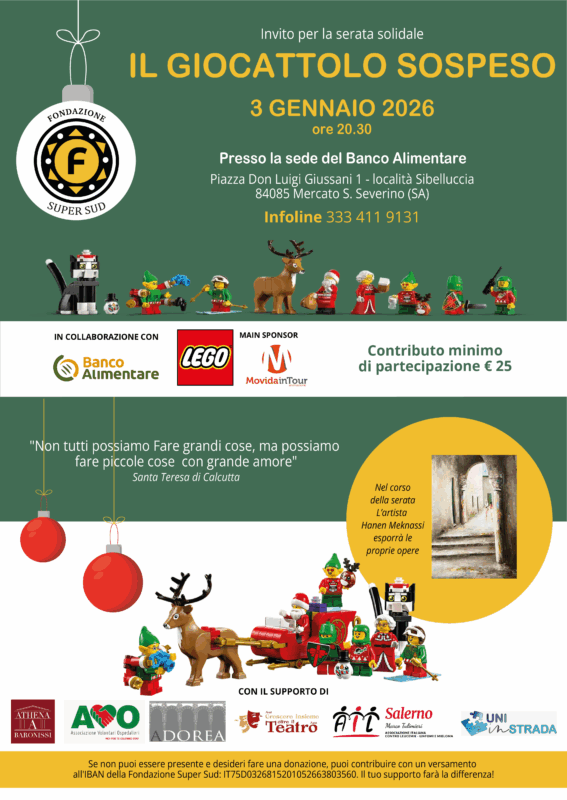 Una sala gremita e un unico grande obiettivo: portare un sorriso ai bambini costretti a trascorrere le festività natalizie in ospedale. Si è conclusa con grande successo l’edizione 2026 de “Il Giocattolo Sospeso”, l’evento solidale promosso dalla Fondazione Super Sud ETS insieme al Banco Alimentare Campania, che anche quest’anno ha rinnovato un gesto di concreta vicinanza ai più fragili. Da sette anni la Fondazione Super Sud porta avanti questo appuntamento di solidarietà, diventato ormai una tradizione sul territorio, e da due anni realizzato in sinergia con il Banco Alimentare Campania. Un’iniziativa che va oltre la semplice beneficenza e che si traduce in attenzione, ascolto e umanità, soprattutto in un periodo delicato come quello natalizio.